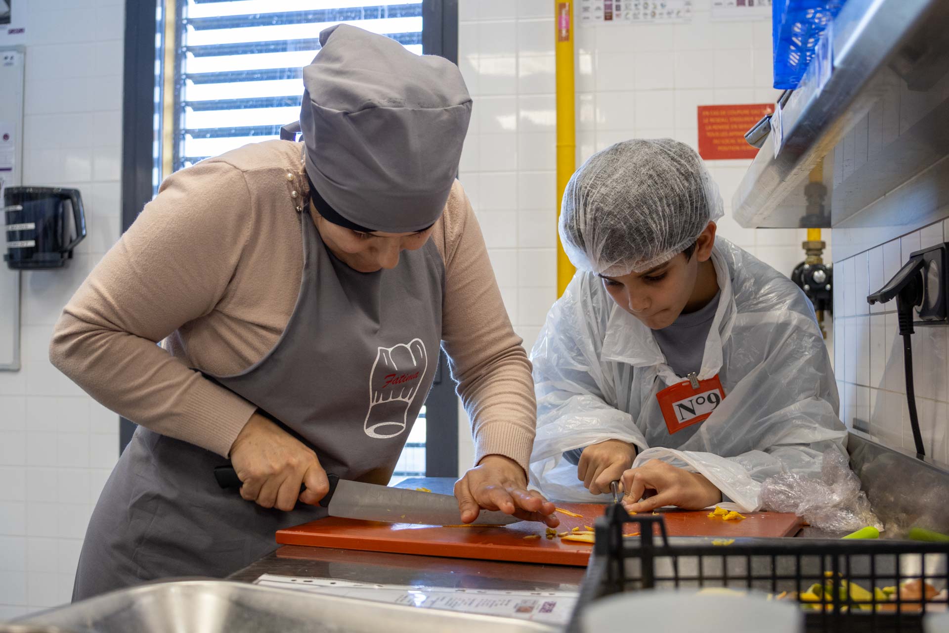 Ça s’agite en cuisine à quelques minutes de la fin du premier challenge « Toques et famille », organisé à l’initiative de Laura Cebti et Marie Benet des centres sociaux de la Roseraie et Jean-Montsarrat de Carcassonne Agglo. Nadia et son fils Nadir, 7 ans, accompagné de Majda posent délicatement les écorces d’orange confites sur les crêpes. « Il vous reste 5 minutes ! », lance d’une voix forte, le chef des cuisines, Frédéric, qui circule entre les postes avec son impressionnante haute toque blanche.