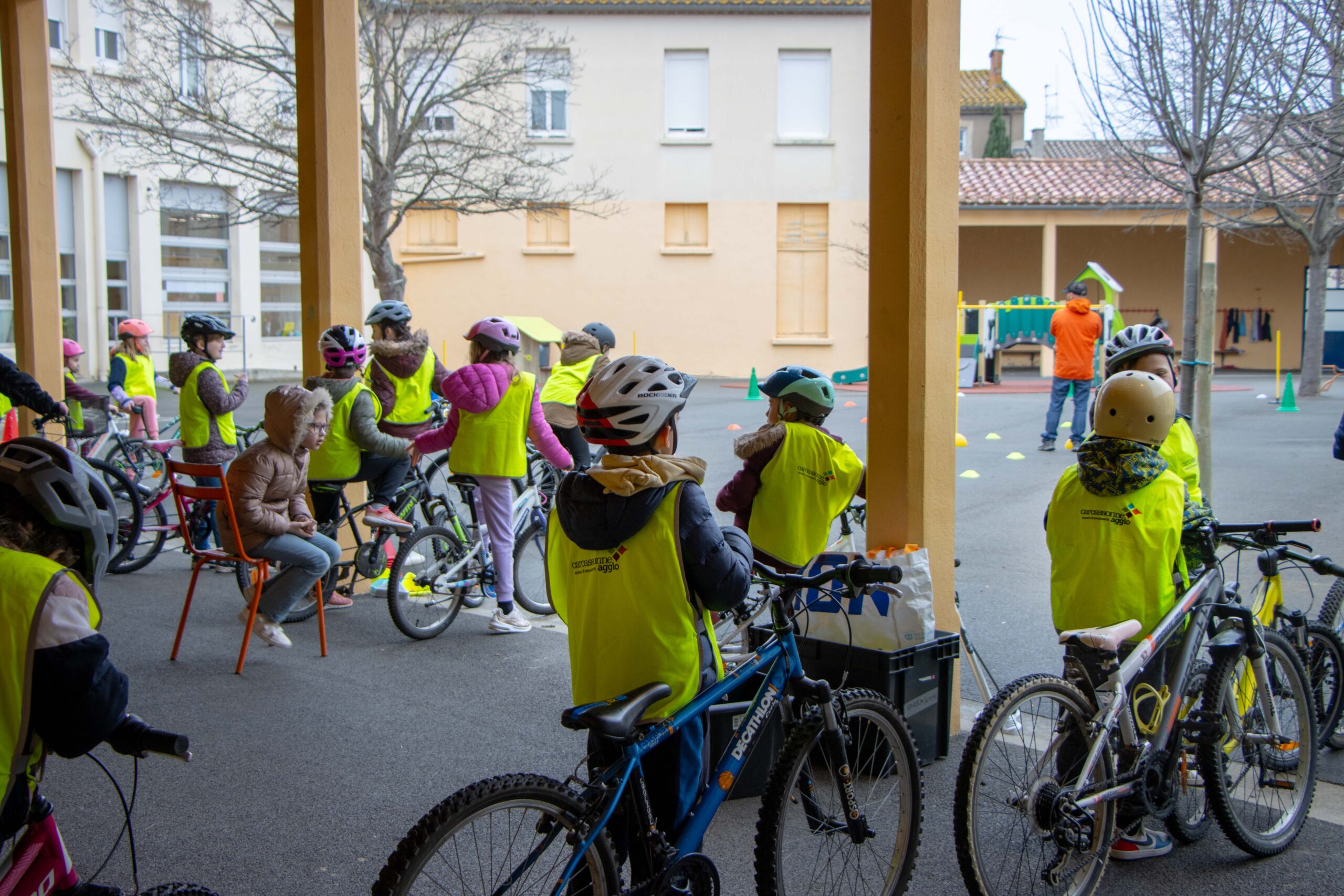 A Puichéric par exemple, après une partie théorique en classe, une quarantaine d’élèves de CE2, CM1 et CM2, casques vissés sur leurs têtes et chasubles fluo aux couleurs de l’Agglo sur leurs dos, ont travaillé leur pratique : jeu l’équilibre dans la cour de l’école, conduire à une seule main sur le guidon, slalom entre des plots, passage sur ou sous une planche…