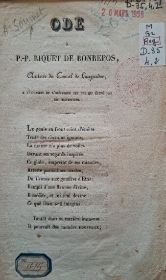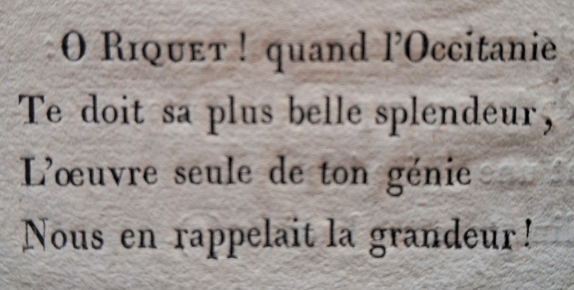 Bien que différents par la forme, ces trois ouvrages, conservés à la Bibliothèque intercommunale de conservation, sont publiés dans un contexte d’enthousiasme patriotique et de réappropriation du passé national. Ils forment un ensemble cohérent : l’établissement durable d’un lieu de mémoire (Caraman), la justification historique et civique (Don de Cépian) et la célébration littéraire (Soumet). Tous participent d’un même mouvement: ériger Riquet en héros civil, à la fois local et national, et inscrire durablement son nom dans la topographie de la France du XIXᵉ siècle.