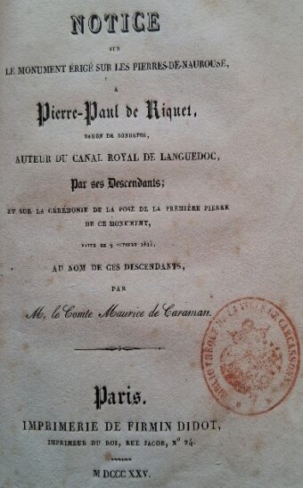 Le premier texte, écrit par le duc de Caraman, se distingue par son intention. Sous une forme en apparence technique, il s’agit en réalité d’un texte fondamental pour comprendre l’ancrage mémoriel de Riquet dans le paysage occitan. La Notice sur le monument érigé sur les pierres de Naurouze s’inscrit dans une démarche commémorative beaucoup plus matérielle.