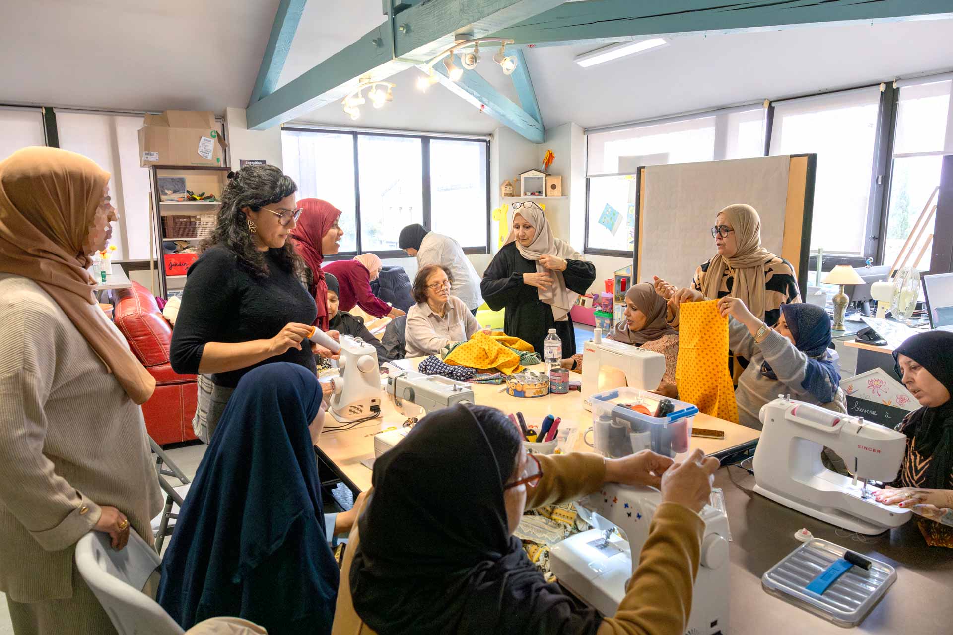 Une fois par semaine, les ateliers se déroulent dans leurs centres sociaux et régulièrement les groupes se retrouvent comme ce lundi d’avril pour partager leur expérience et faire du lien social. « Ce sont plutôt des débutantes qui participent, témoigne Badra, co-président de Cultur’aile et titulaire d’un BEP de Haute-Couture. Cela leur permet d’apprendre les bases de la couture pour faire de petites réparations. »