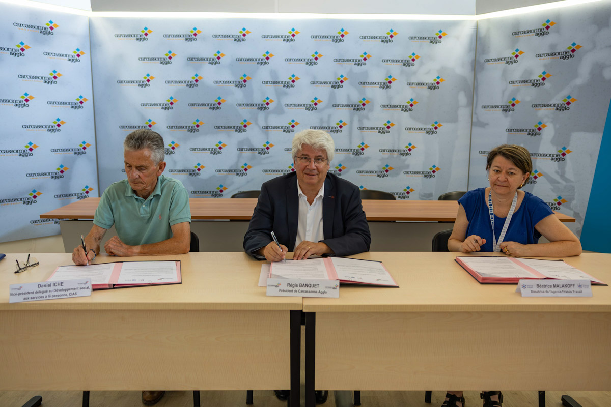 Le renouvellement de ce partenariat a été signé par Régis Banquet, Daniel Iché, vice-président en charge du Développement social, des services à la personne et du CIAS, et Béatrice Malakoff, directrice de l’agence France Travail de Carcassonne, représentant la directrice régionale Karine Meininger.