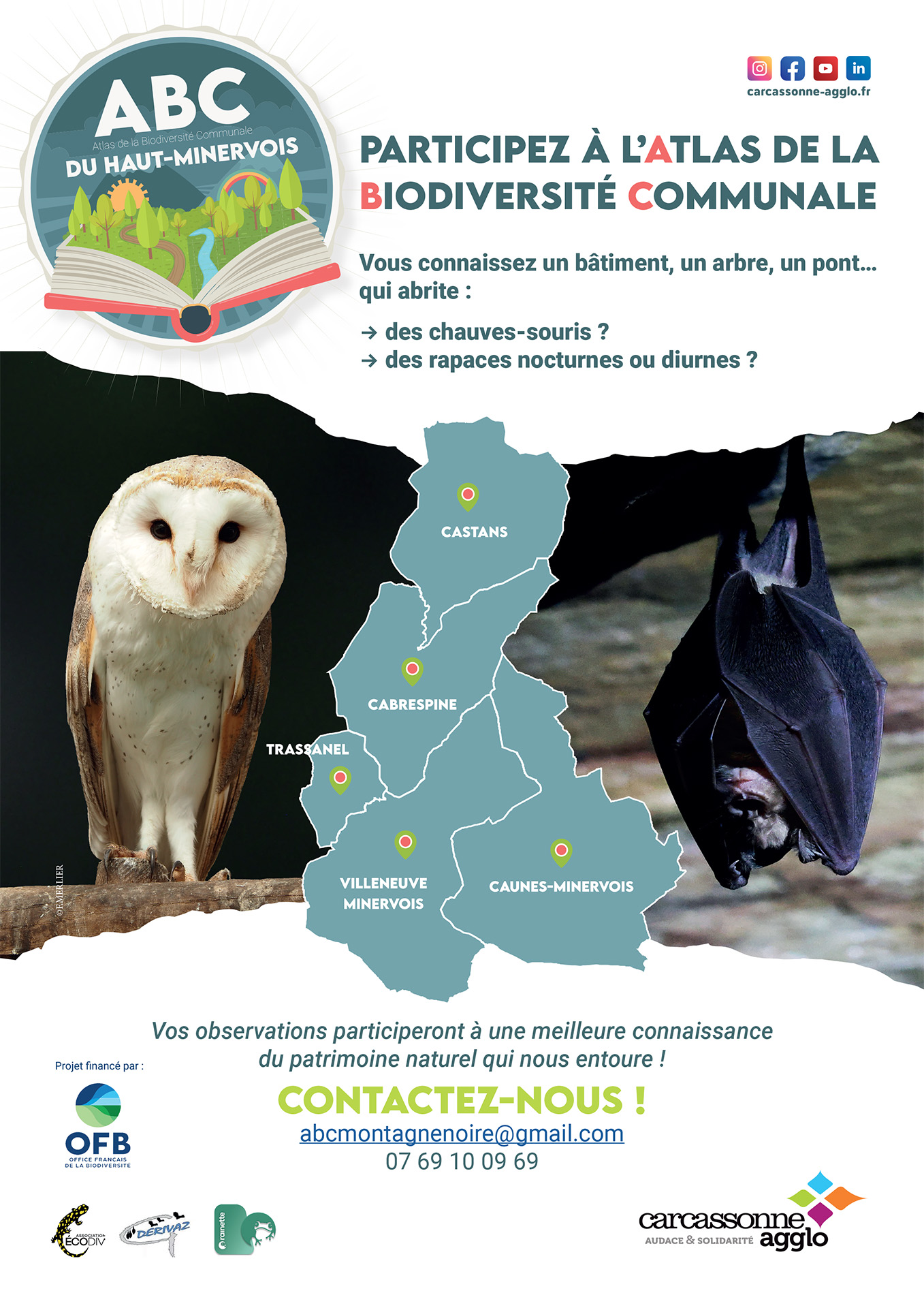 Alors si vous connaissez un bâtiment, un arbre, une grange, un pont qui abrite des chauve-souris, des rapaces nocturnes ou diurnes, n’hésitez pas et venez contribuer à la belle aventure de l’Atlas de la Biodiversité Communale du Haut-Minervois.