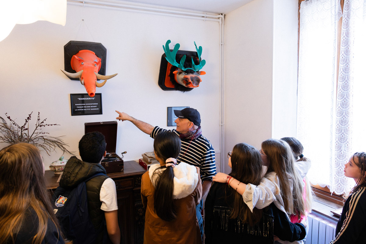 Bibi a accueilli Ethan, Sebastian, Lindsay et leurs petits camarades chez lui – une trentaine en tout – au milieu de ses “Trophées de chasse” exposés jusque dans son salon : Gaspard, l’hippopotame du Groenland traqué rue de la Huchette, Wim, le grand crocodile des Flandres, Hermann, le grizzly abattu place de la Concorde, Anita, le bison corse abattu au Casino de Paris, mais aussi une baleine blanche ou encore un grand alligator sorti de la rue des Archives…