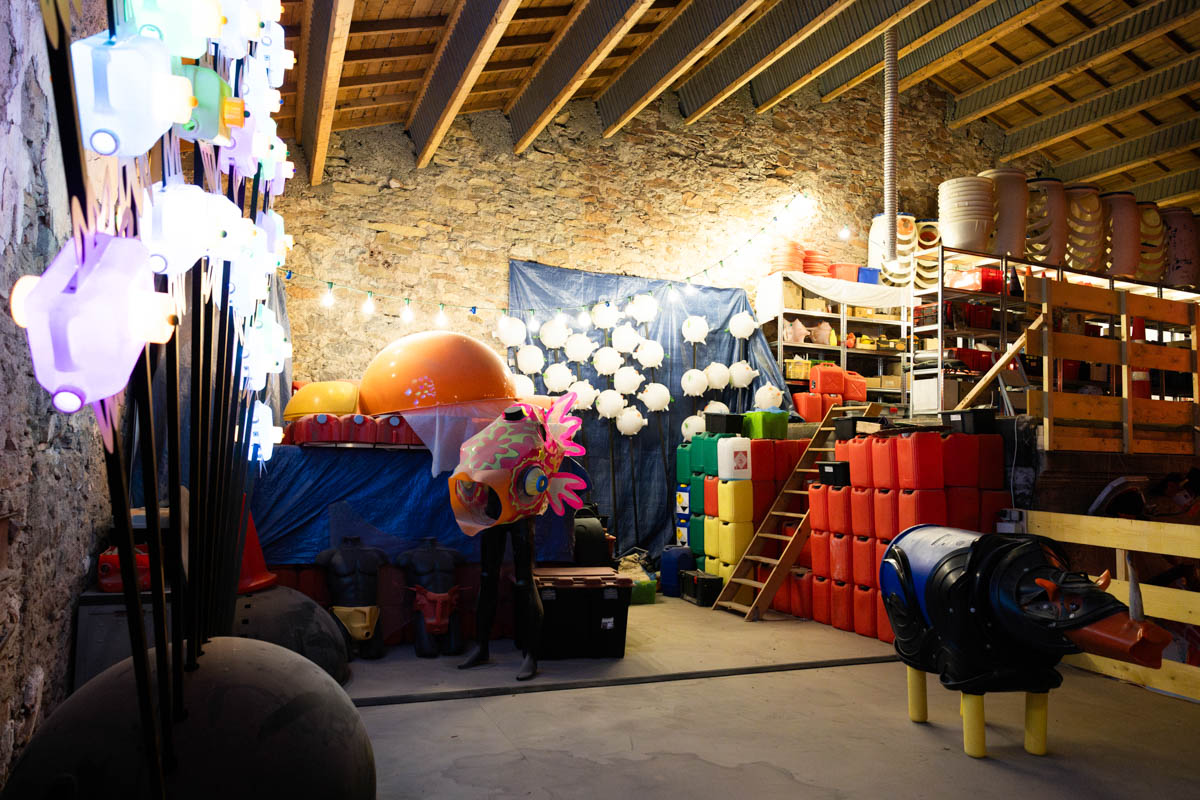 Il s’agit en fait de sculptures originales, faites d’objets en plastique récupérés : bidons, cônes de signalisation… Car, outre sa volonté de partager son art, Bibi, non loin de son Bibigloo en feu, abordent aussi avec les jeunes les enjeux économiques pour la planète.