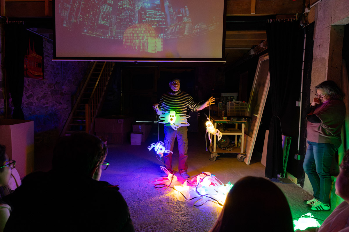 Ensuite, dans l’atelier attenant, véritable “arche de Bibi”, sous ses conseils et à la lueur d’un arbre à poissons, les ados de Barbaira, Badens, Caunes-Minervois, Rustiques, Marseillette et du Val-de-Dagne, à tour de rôle et munis de gants, ont laissé libre cours à leur imagination pour la fabrication de drôles d’oiseaux lumineux, à grands coups de ciseaux et avec des bouchons en plastique en guise d’yeux…