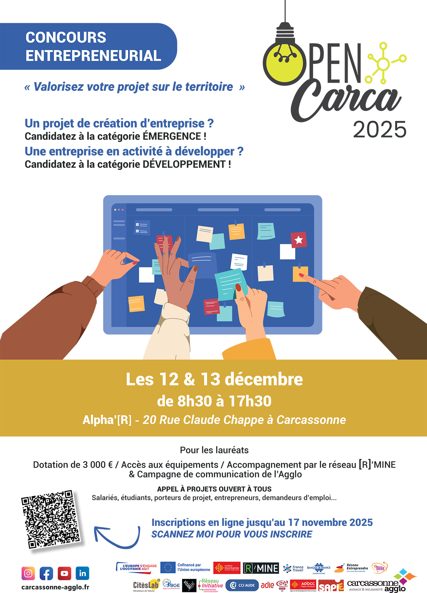 Organisé pour la 7ème édition par Carcassonne Agglo avec les partenaires locaux de la création et de la gestion d’entreprise, ce concours entrepreneurial est ouvert à tous, y compris aux projets non immatriculés !