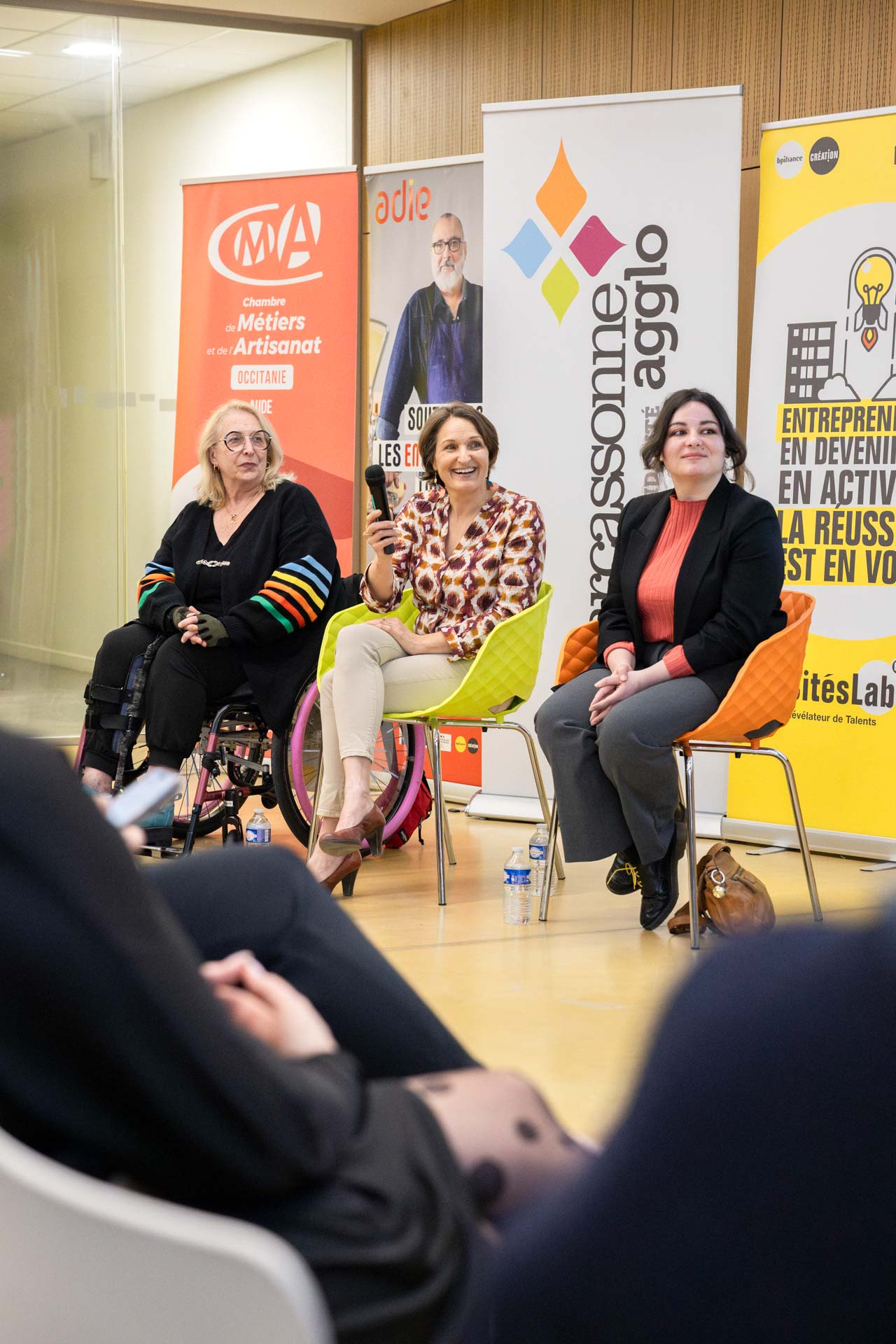 Une table ronde qui avait pour objectif de répondre à un certain nombre de questions à commencer par qu’est-ce qu’entreprendre ? Pour Fanny Lignières, dirigeante de ACCAPDIS, conseil aux entreprises, « c’est avoir une idée obsessionnelle et se dire il faut absolument que je tente ça. » Pour Laetitia Bellandi, photographe indépendante, « c’est la liberté » ou pour Marion Mainguin, Artisane et fondatrice de M.A.D (Métal Art Design) Ferronnerie d’Art, « c’est choisir avec qui on travaille et pour qui on travaille ». Autant de visions différentes avec ce goût de la liberté en opposition à leur situation professionnelle précédente du salariat.