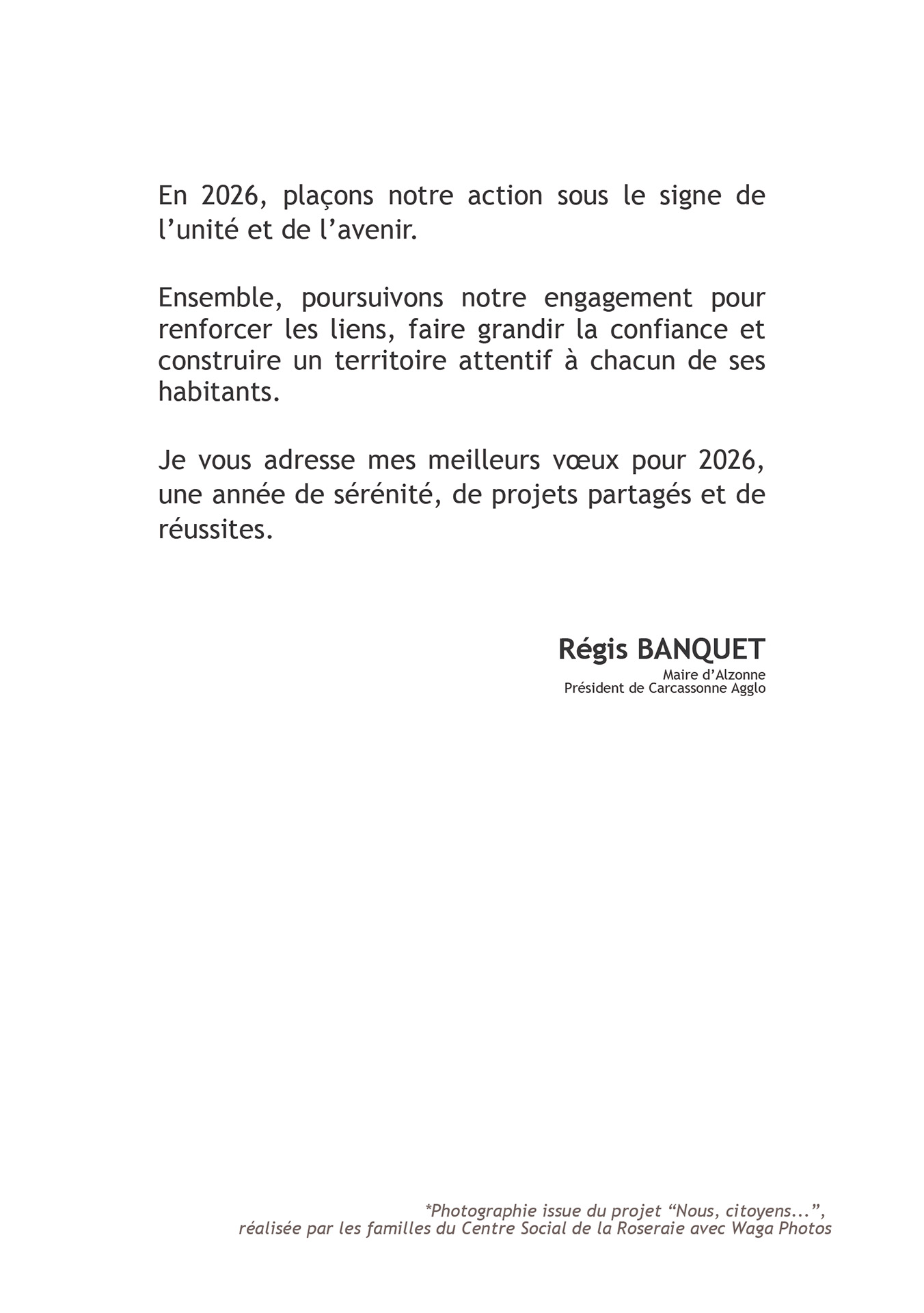 En 2026, plaçons notre action sous le signe de l’unité et de l’avenir. Ensemble, poursuivons notre engagement pour renforcer les liens, faire grandir la confiance et construire un territoire attentif à chacun de ses habitants. Je vous adresse mes meilleurs vœux pour 2026, une année de sérénité, de projets partagés et de réussites.