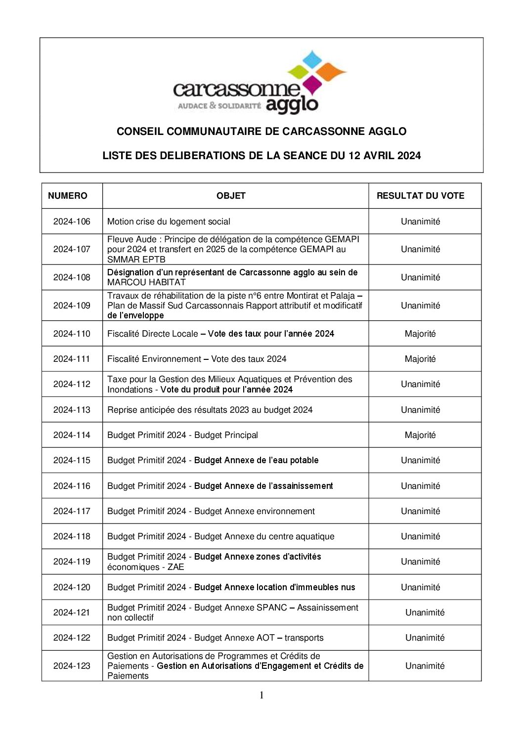 Liste des délibérations du conseil communautaire du 12 avril 2024