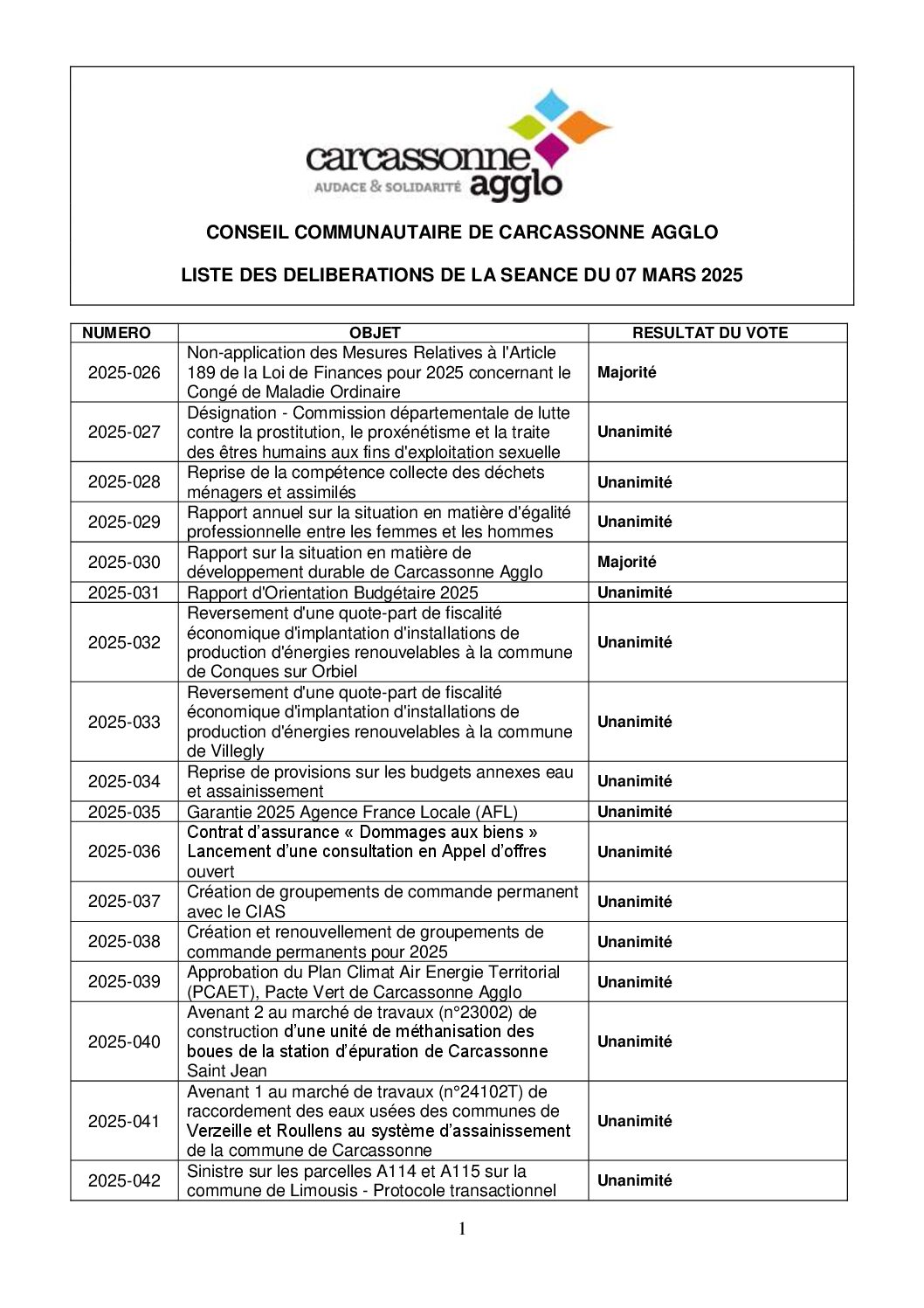 Liste des délibérations du conseil communautaire du 07 mars 2025
