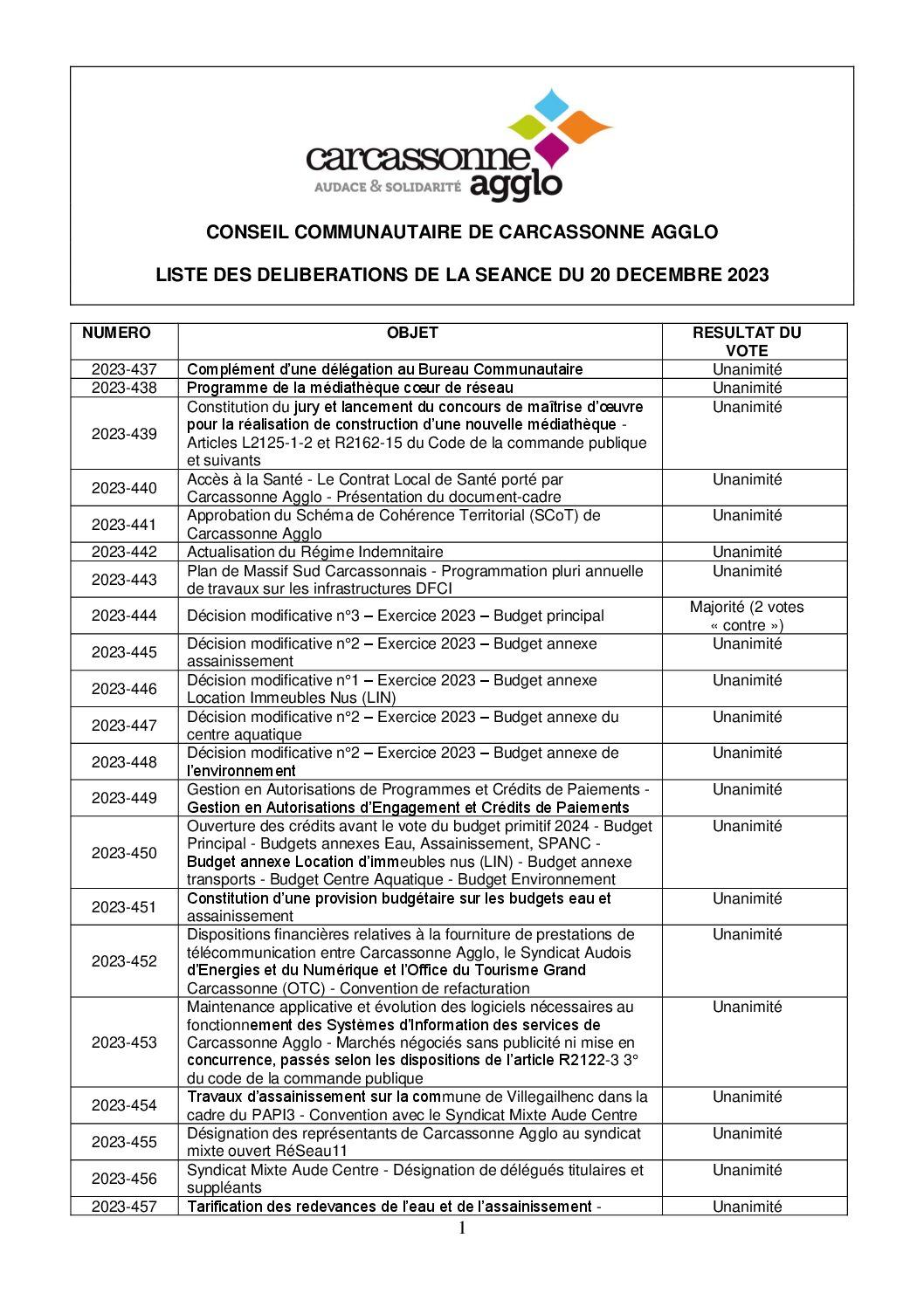 Liste des délibérations du conseil communautaire du 20 décembre 2023