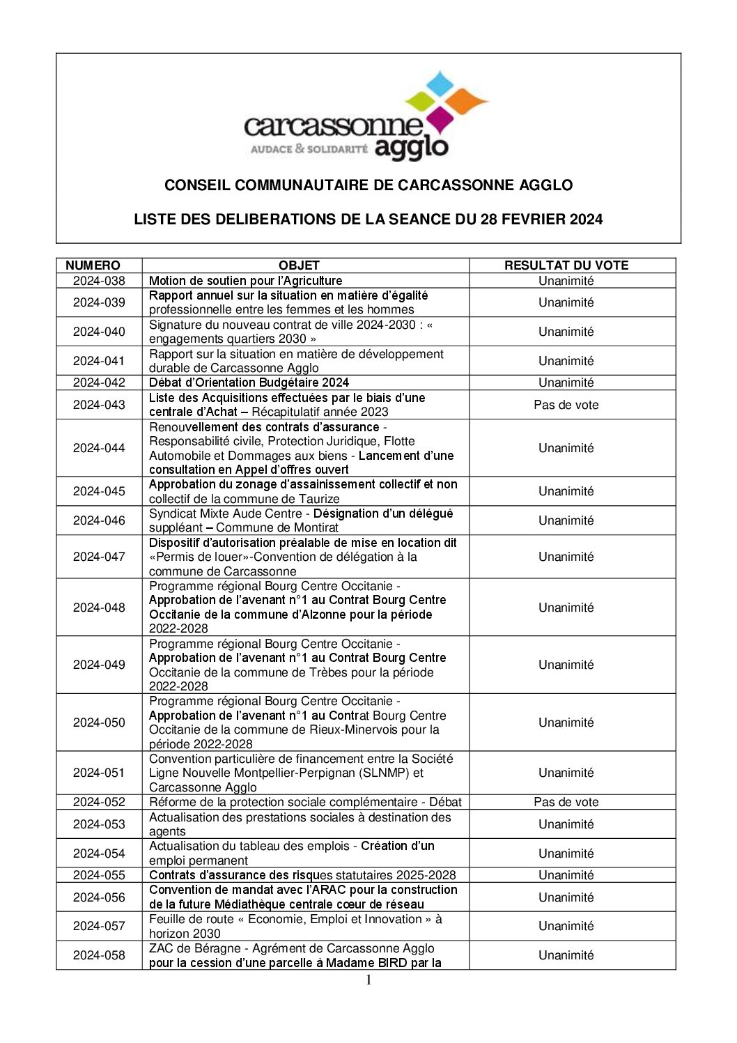 Liste des délibérations du conseil communautaire du 28 février 2024