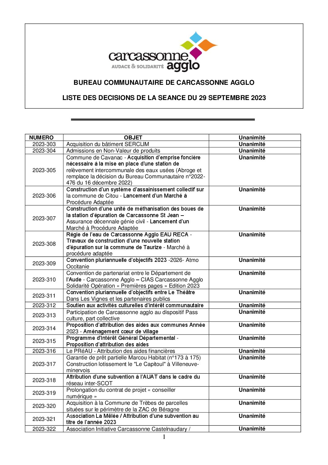 Liste des délibérations du bureau communautaire du 29 septembre 2023