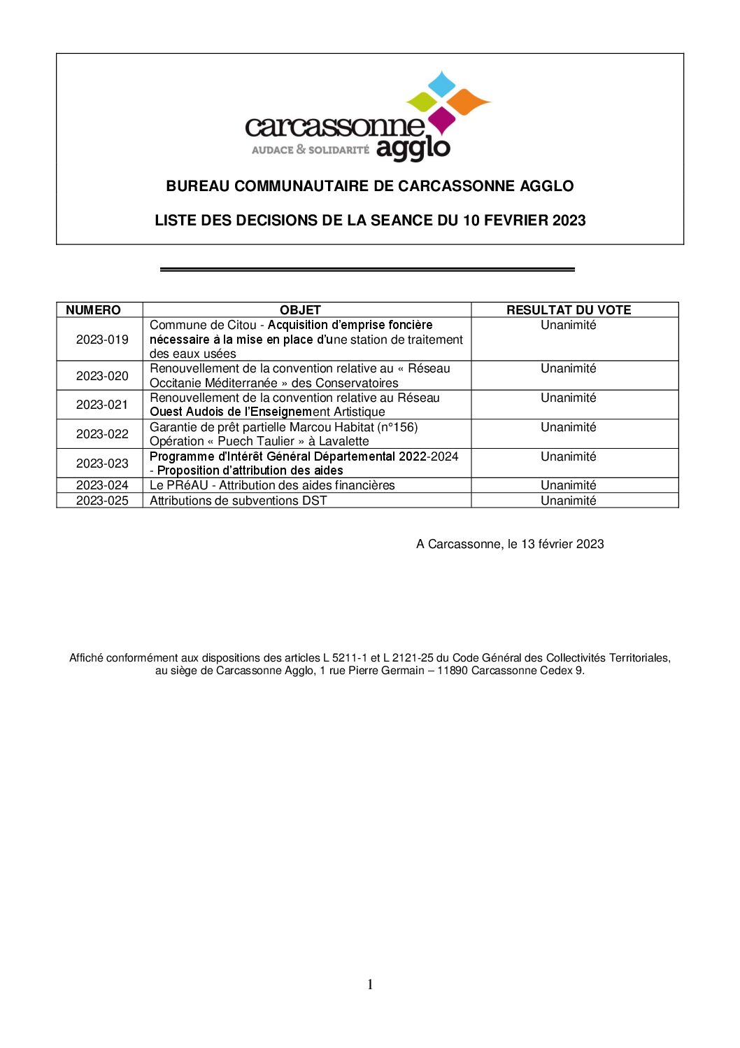 Liste des délibérations du conseil communautaire du 10 février 2023