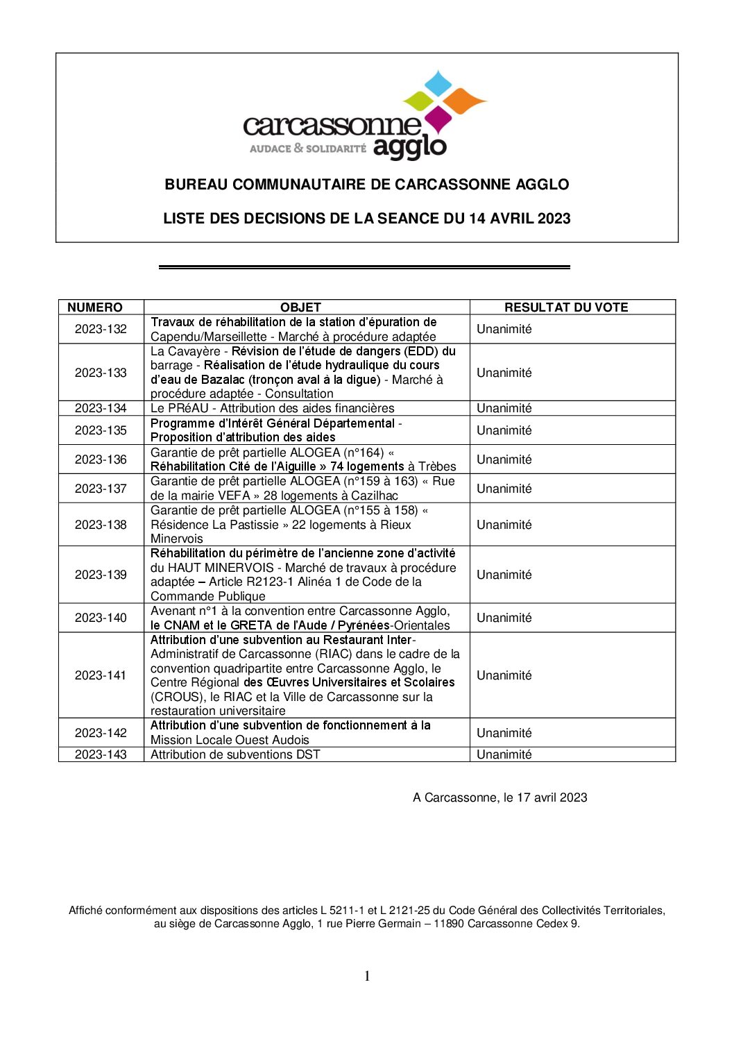 Liste des délibérations du bureau communautaire du 14 avril 2023
