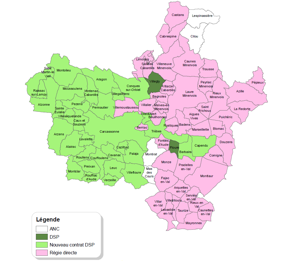 Sur les 83 communes du territoire de Carcassonne Agglo, le service public de l’eau potable et de l’assainissement est assuré par 2 modes de gestion différents.