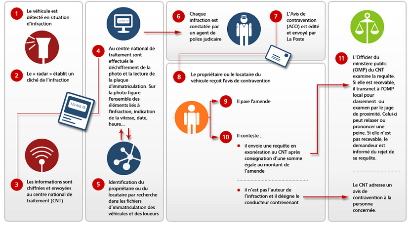 Étapes depuis le flash radar jusqu’à l’envoi de l’amende au propriétaire ou au locataire du véhicule et les possibilités de paiement ou de contestation